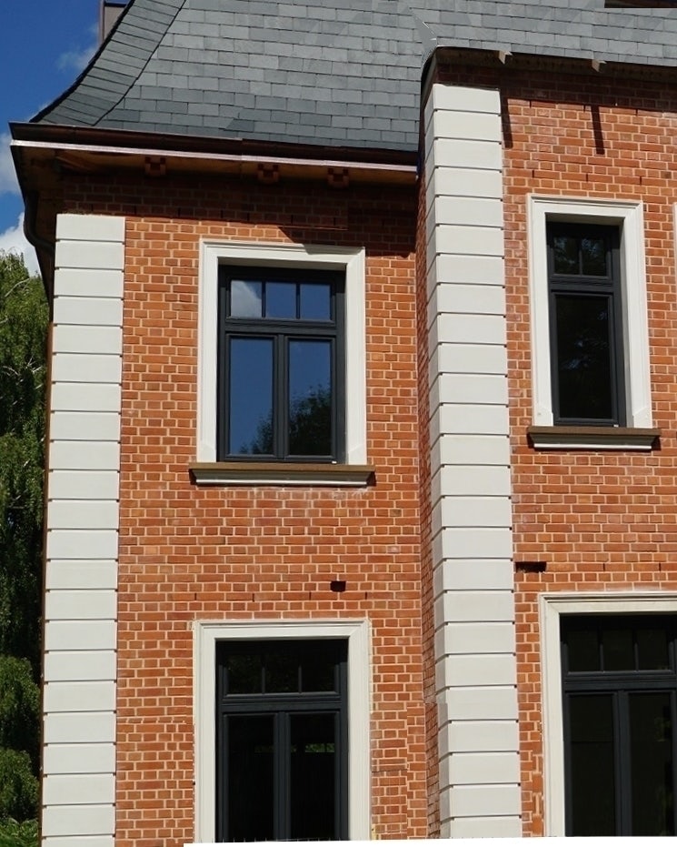 Dünnwandige profilierte Betonplatten mit System für die nachträgliche Verschönerung der Hausecken. Unsere Bossensteine aus Beton können bei Klinkerfassaden, aber auch bei Putzfassaden eingesetzt werden. Sie bieten einen perfekten Schutz der Hausecken der Außenfassade gegen Schlag- und Stoßkräfte. Unsere dünnwandigen Betonbossen weisen angegossene Gehrungen und Fugen auf. Die Bossensteine lassen sich einfach montieren und geben der Fassade ein unverwechselbares Gesicht. Die Bossenplatten werden in weißgrau geliefert. Eine individuelle Farbanpassung durch einen bauseitigen Anstrich ist möglich.