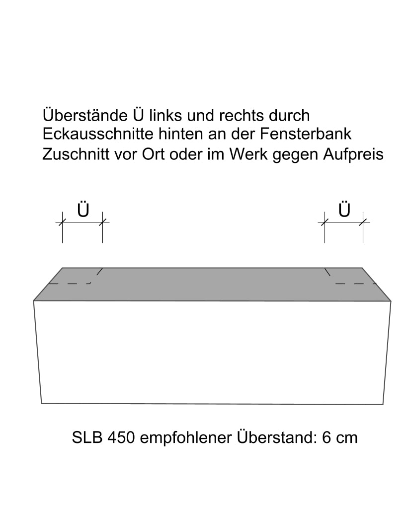 Diese elegant schlichte und stabile Fensterbank SLB 450 aus Beton mit ihrer glatten Oberfläche passt sowohl zu modernen Neubauten, als auch zu Altbaufassaden. Obwohl diese geradlinig schlichte Außenfensterbank von außen sehr massiv wirkt, kann sie auf Grund ihrer Bauform als dünnwandige Betonschale auch gut auf gedämmten Fassaden mit Dämmsteinen oder Wärmedämmverbundsystem (WDVS) wärmebrückenfrei eingebaut werden. Die Lieferfarbe ist weißgrau. Eine individuelle Farbanpassung kann durch einen bauseitigen Anstrich erfolgen.