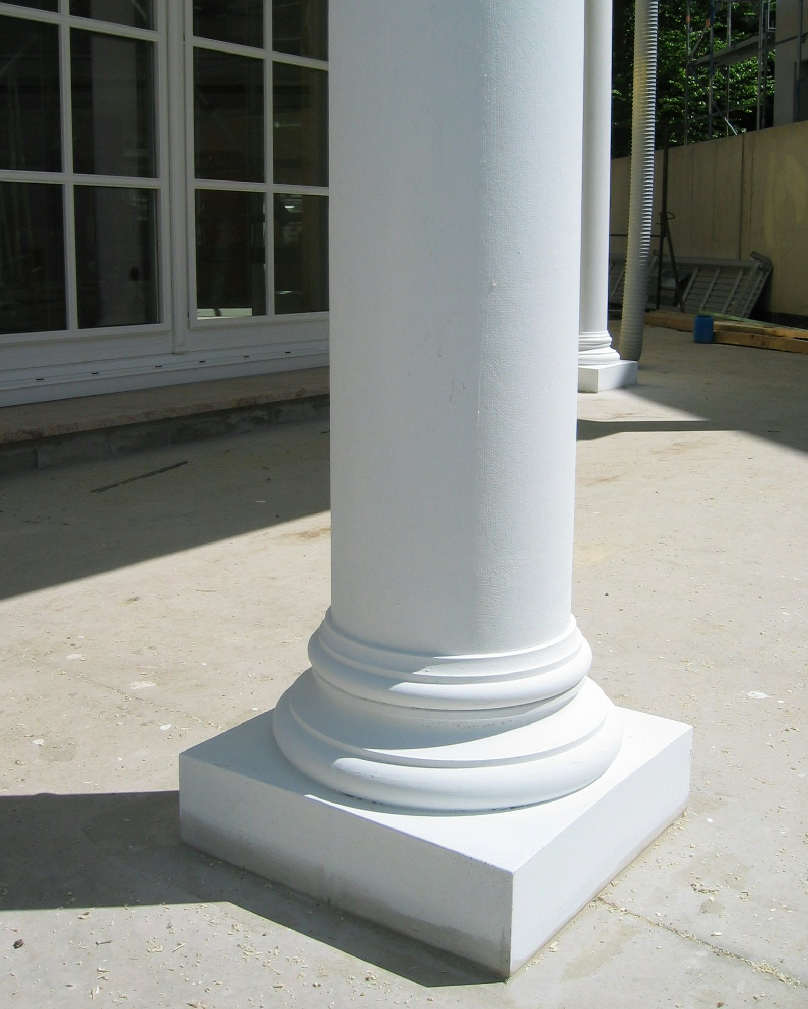 Alle Elemente werden jeweils in Halbteilen und mit einer zum jeweiligen Säulendurchmesser passenden inneren runden Aussparung geliefert. Darüber hinaus sind auch formschöne Basen und Kapitelle für eckige Säulen lieferbar.