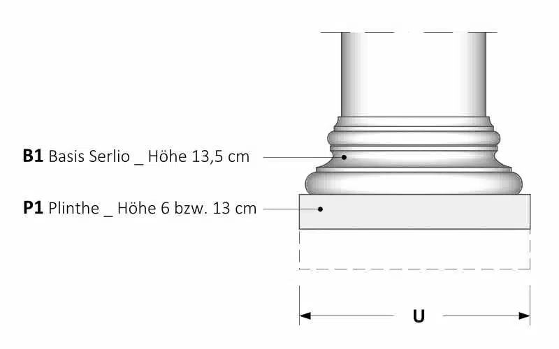 Unsere eckige Säulen-Plinthe P1 wird in Verbindung mit einer runden Säulenbasis verwendet. Zusammen mit der runden Säulenbasis ergibt sich ein schönes Aussehen für den Fuß einer Säule.