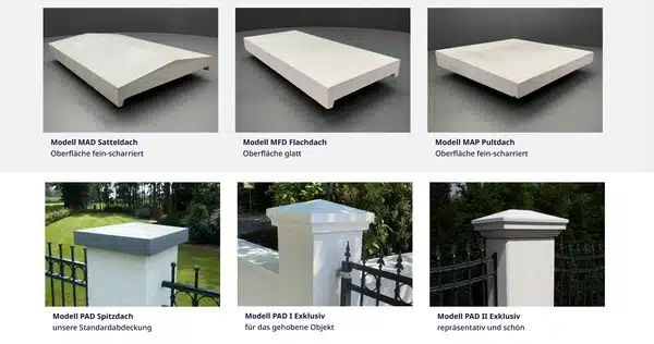 Mit unserer hochwertigen Pfeilerabdeckung PAR Walmdach können auch rechteckige Pfeiler perfekt abgedeckt werden. Die feine bzw. bei einigen Größen auch grobe Scharrierung (Rillen) an den Elementoberflächen sorgt für ein schönes Aussehen dieser Pfeilerabdeckung. Auch die rechteckige Pfeilerabdeckung PAR in Walmdachform weist an der Unterseite eine aufwendige Ausklinkung auf. Dadurch entstehen ausgeprägte Tropfkanten an allen vier Seiten. Häßliche Wasserablaufspuren an Ihrem rechteckigen Pfeiler gehören damit der Vergangenheit an.